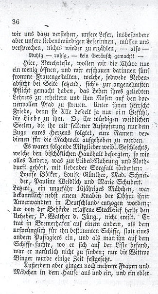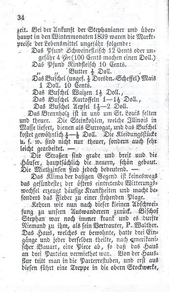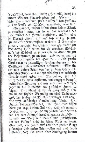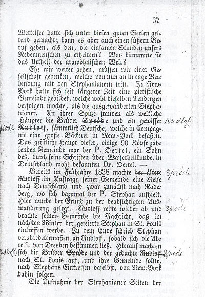 Before we go any further, we must mention a congregation which from now on would be closely associated with the Stephanists. Some time back a pietistical congregation with inclinations similar to the emigrating Stephanists had established itself in New York. Its lay leaders were Brother Spröde [Rudloff] and a man by the name of Rudloff [Spröde], two Germans who jointly owned a large bakery in New York. The spiritual leader of this congregation of 90 was Pastor Oertel, son of Dr. Oertel who had become well known for his writings on hydropathy. In the spring of 1838 the elder Rudloff [Spröde] made a trip to Germany at the commission of his congregation and came to Radeberg, where he stayed with Pastor Stephan. Here the plans for the intended emigration were laid. Rudloff [Spröde] returned to New York and reported to his congregation that next winter the celebrated Stephan would go to St. Louis. Per their agreement, Stephan wrote to Rudloff [Spröde] when he was ready to depart from Dresden. After receiving the letter Brother Spröde [Rudloff] and Rudloff [Spröde] went to St. Louis and their congregation was supposed to leave New York once Stephan arrived. |