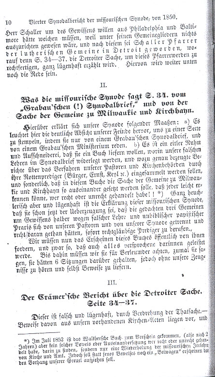b) Crämer lies in stating that he did not give information to his gang (page 35). He told the gang about his arrival but not Pastor Winkler. Now Mr. Crämer merely regrets that Pastor Winkler was not informed! Mr. Crämer arrives merely as a third party of an investigation committee and immediately takes up residence with one of the mutineers and holds a meeting with the mutineers in this house; at this meeting, according to reliable reports we have received, he laid out his teachings concerning the preaching office and the spiritual priesthood. Subsequently on May 2, 1850 he comes to Pastor Winkler's house with a companion and legitimizes his presence as a committee member to Pastor Winkler! He does not conduct himself as a brother in office but as a country judge and member of the gang! He holds meetings with the gang behind Pastor Winkler's back, conducts discussions, etc. as though he were a fully vested member of the gang, not as a Christian investigator and an arbitrator of the dispute. c) Crämer lies in passing himself off to Pastor Winkler as a disinterested observer in the matter; there is a great difference between being disinterested about a presumed party member and our individual church matter. Mr. Crämer goes to Monroe while Pastor Winkler formed his committee, comes back and learns that I can and will not form a committee with Mr. Crämer and his crew. He then sets a date without asking! A district judge! d) Pastor Winkler now traveled to Buffalo and upon his return attempted to sway his congregations into joining the Buffalo Synod, thus insulting the Missourians! This is untrue. In their many meetings Pastor Winkler did nothing other than set forth the teachings and practices of both synods — the rural congregations joined the Buffalo Synod as did the city congregations amid the quarrel and alarm of the gang leader. The result of a written ballot produced not one single vote for the Missouri Synod. e) On June 7th or 10th Mr. Crämer received word from Pastor Winkler that no committee would be formed and therefore his presence was neither necessary nor of any purpose. Then on June 12th Crämer was requested by means of an urgent invitation from the mutineers to come quickly because Pastor Winkler was scheming to hinder their case by having it handled by a nonpartisan church court since he wanted to bring them under the Buffalo Synod. N. B. Thus his decision and that of the congregation to join the Buffalo Synod was presented as a scheme. When Crämer hears of a scheme, he goes to them immediately — as a man with no appointed vocation — on this own authority he had set June 13th as the date and then he hears that his presence as a committee member will be useless — so now he goes as a party man at the call of his party, meets with Pastor Winkler in his house and starts a quarrel with him! A veritable scoundrel! Any reasonable Christian and lover of the peace would not have responded to such a summons; he should have responded to the calling or baiting party, I have been told that no committee has been formed; you must first come to an understanding with your pastor and your congregation. In this Christian manner you will become united in permitting an investigation into the matter. If I can serve to bring about peace in this matter I shall do so. It is not within the scope of my office to consider whether you deem the Buffalo Synod false. You have to bring that matter before your pastor in your congregation and provide proof since you have said that he schemes against you to bring in the Buffalo Synod. I will not involve myself in another pastor's intrigues, however if I should come to you I will come as one properly appointed with the knowledge and consent of your pastor and congregation as an investigative committee member or as the member of another peaceful church court — but not as one who rushes to involve himself in another person's supposed intrigues. Crämer came without Christian and proper calling to Detroit in order to alert his party of Winkler's schemes, according to his own interpretation! — How utterly different my response was to these same people, who had approached me in March and 2 and a half months previous, saying that I should come and take up their case since they wanted to separate from Pastor Winkler and would have to get themselves a pastor! I responded to them, this matter requires a proper investigation and I have no ordained authority to do this so long as your pastor and your congregation do not place a request that I come to investigate or arbitrate the matter. They thought ill of me for this and ran to Missouri for assistance.