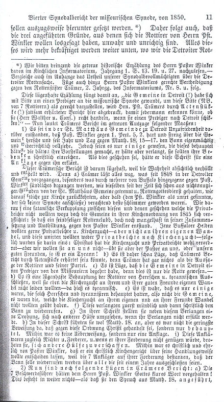 _____ * We urgently request that the true history related by Pastor Winkler, available in Kirchliches Informatorium, Volume 1, pages 13, 19 and 27 be consulted. Compare this with the verdict of our synodal authorities concerning the Detroit rebellion. Also include Pastor Winkler's proper defense against the inciter of the rebellion, Crämer in the Informatorium, Volume 2, No. 8 and subsequent issues. This false story begins, "the congregations in Detroit (!) have related a request for a preacher from the Missouri Synod; in order to establish that this request (N.B. - made by 7 mutineers) is appropriate, Pastor Crämer has copied from the official documents (!) a sufficiently corroborating report, in which anyone may see whether they (Mr. Walther and the Conference) will be conducting themselves properly if they send a preacher to Detroit!" — Here is a true extract from Crämer's report: 1) Discontent has arisen within the St. Matthew's congregation in Detroit because Pastor Winkler ruled harshly and stringently over the congregation in contradiction to 1 Peter 5, 2, plus in contradiction to Matthew 18: 15 - 17 he has arbitrarily and improperly exercised the ban for a long period of time. There have only been a few people, who have made this claim and they presented their concerns to him in writing, as he had requested. He then declared that these letters were accusations made against him. The Crämer report is a lie because the truth was intentionally disguised and distorted: