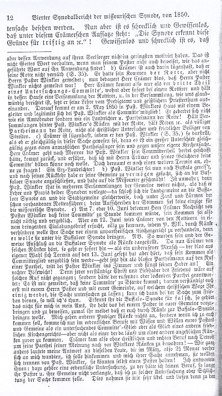 b) It is a lie that Crämer could have copied this report from official documents since he has nothing here but the testimony of the mutineers and his sect. c) It is a lie that the congregation in Detroit wanted a preacher from the Missourians since it had only been the gang. d) The statement concerning domination and tyrannical excommunications made by the mutineers is false because they simply did not want to endure church discipline for their conduct or that of their friends; hence they called it tyrannical. e) It is true that there were only a few individuals, who had claimed that there was domination and tyranny, so it was not the congregations, which did not want to endure church discipline for their conduct or that of their friends. f) At first these people requested verbally and then in writing that the ban be lifted. g) In these letters they placed a threat along with their request that they would seek assistance from other quarters if their requests were not granted. h) In these letters they cited Matthew 18 but no proof was provided that Christians were being handled contrary to this ordained mandate. There were merely declarations, which provided no proof, only accusation. i) These accusers were both judge and plaintiff and if their charges were not settled to their satisfaction, they would seek help elsewhere. It was Christian and honorable of Pastor Winkler, that he was willing to let a Christian court deliberate on his method of handling the situation because the 7 accusers stood by their demand that the ban be lifted against all those who had been excommunicated in the past year. 2) Here are more of the lies in Crämer's report: