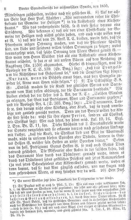 10) Prof. Walther professes on page 8 that it is not a matter of intermediate issues but teaching itself which keeps it beyond their power to forgive and forget things for the sake of charity and peace; thus one minor point is worth more than the entire world with all its wisdom and treasures which the true church will solely acknowledge; it concerns the highest treasury in which all other treasures are contained, etc. — But then on page 9 he states that among the points of contention there are no fundamental issues; plus they would distance themselves from those issues in which, as the Buffalo Synod understands it, there lies the accusation of heresy for confusion, lovelessness and sacrilege. This is hypocrisy. For seven years they have accused us of heresy since they use that accusation to vindicate all our rebellious church members, who felt compelled to separate themselves from us because of the papistry we taught and conducted. In this same synodal report on page 34 they state their synod is convinced that the congregations (that is, the mutineers) in Kirchhayn, Freystatt and Milwaukee separated themselves from their pastors and synod only for reasons of conscience because of the false teaching and papal practices of their pastors and they had properly appointed a righteous faith preacher immediately. This is nothing other than an accusation of heresy.