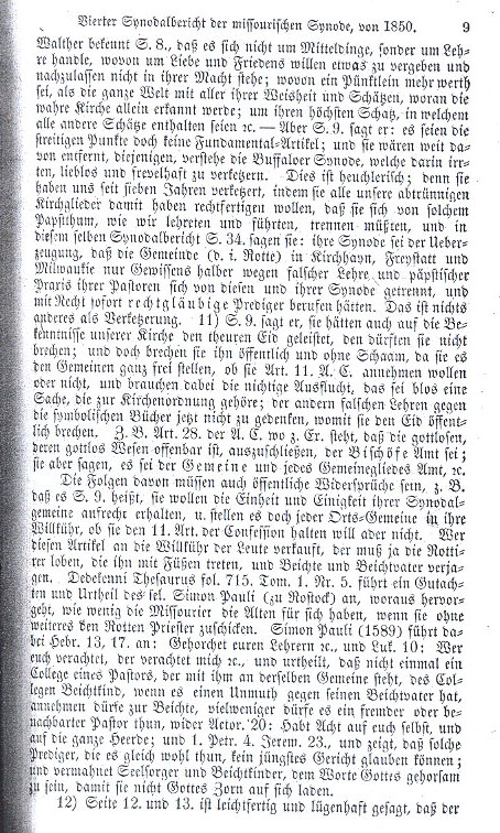 11) On page 9 he states they had also sworn a sacred oath to the profession of faith of our church and they would not break it. And yet they broke it often and without shame when they set the congregations free regardless of whether they accepted the 11th Article of the Augsburg Confession, using the invalid excuse that this was merely a matter of church orders and that they were not currently contemplating false teachings dealing with the symbolic books, whereby they would blatantly break their vow. For example, Article 28 of the Augsburg Confession where it states that it is a duty of the bishops' office to excommunicate those who are godless and publically led godless lives. They, on the other hand, state that it is the duty of the congregations and the office of each congregational member, etc. The consequences of these things are obvious contradictions. For instance, on page 9 he states they want to uphold the unity and harmony of their synodal congregations and place it within the discretion of each district congregation whether or not it will uphold the 11th Article of the Augsburg Confession. Whosoever would ransom this article at the discretion of the populace would certainly praise the gangs, which tread it under their feet and do away with confession and confessors. The Dedekenni Thesaurus, Issue 715, Volume 1, No. 5 cites the case and verdict of blessed Simon Pauli (at Rostock) where it comes out how little regard the Missourians have for the Acta when they send off rogue priests without due consideration. Simon Pauli (in 1589) cites from Hebrews 13, 17, "Obey your teachers," etc. and Luke 10, "Whoever despises you, despises me," etc. Pauli renders the verdict that nowhere within the course of study is a pastor taught that he should accept the confession of a parishioner from his congregation if the parishioner is displeased with him and in even fewer cases should a foreign or neighboring pastor perform the confession, in contradiction to Acts 20, "Watch over yourselves and the entire flock." In 1 Peter 4 and Jeremiah 23 it demonstrates that any preacher, who would do such a thing, could not believe in Judgment Day and it warns spiritual caregivers and children of confession to be obedient to the word of God lest they invite the wrath of God upon themselves. 12) On pages 12 and 13 it is frivolously and deceptively stated that |