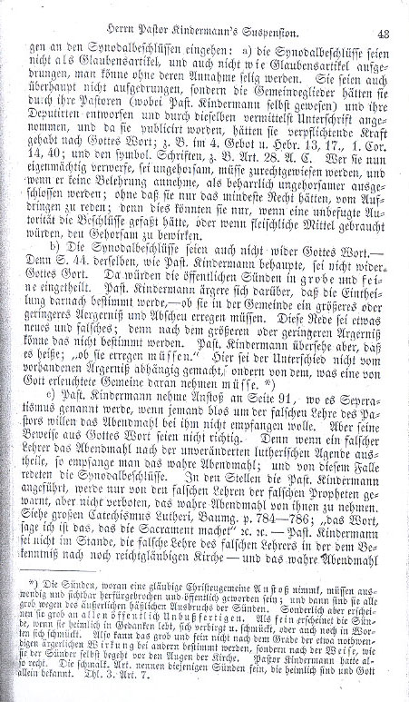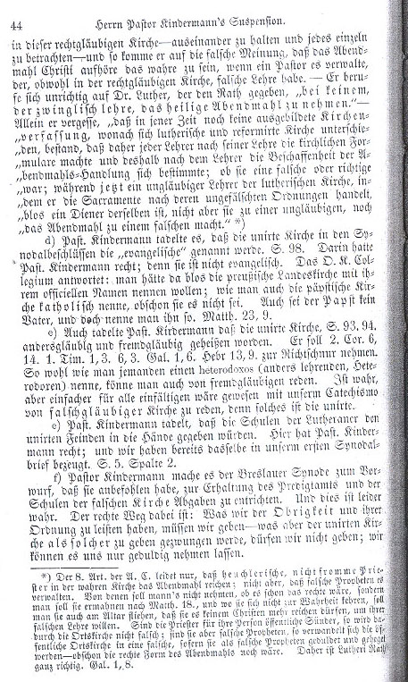 b) The synodal decrees were also not contrary to God's word — Then page 44 was not contrary to the word of God as Pastor Kindermann stated. Hence public sins were divided into gross and petty ones. Pastor Kindermann was vexed that this division was made, — whether they should incite a general alarm or a lesser warning within the congregation. This discourse presented something new and false; there should be no distinction between a general alarm and a lesser warning. However Pastor Kindermann noticed that it stated, "whether they should incite." The degree of action was not made dependent upon the nature of the offense but on what a God enlightened congregation would make of it. * c) Pastor Kindermann objected to the statement on page 91 where it was called separatism if someone did not wish to receive the eucharist from a pastor because he was charged with preaching false doctrine. However his proof derived from God's word was not correct. According to the unchanged Lutheran Agenda, when a false teacher administers the eucharist, people still receive the true sacrament. The synodal decrees discussed this scenario. In the passages Pastor Kindermann cited there was only a warning about the false teachings of false prophets but no interdiction against receiving the true eucharist from him. See the large Luther Catechism, pages 784 - 786. "I say, it is the word which makes the sacrament, etc." — Pastor Kindermann was in no position to compare the following two ideas or focus on either: