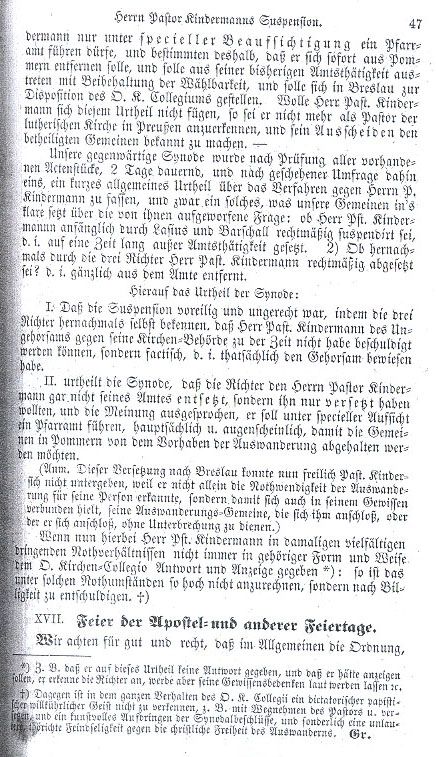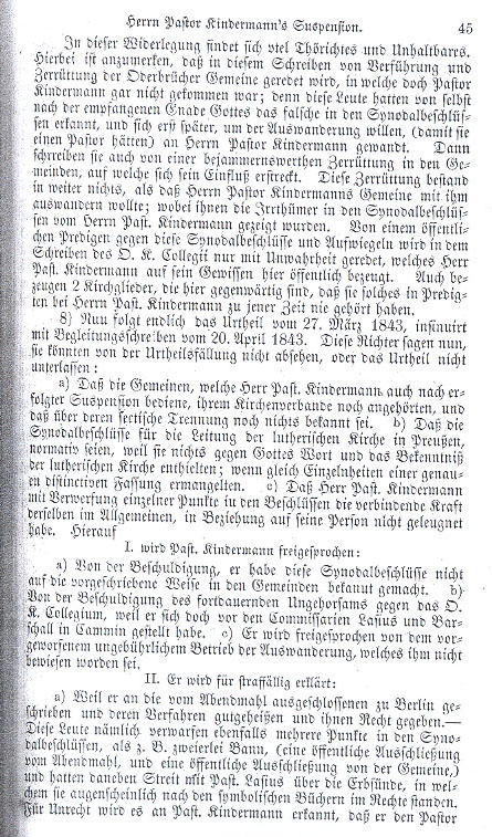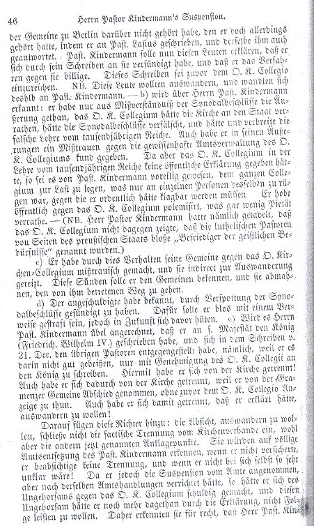 b) Concerning Pastor Kindermann it was decided that he had made his pronouncement concerning the synodal decrees based on several errors in comprehension - He stated that the Upper Church College had betrayed the church to the State; he had misrepresented the synodal decrees and he had spread false doctrine concerning the thousand-year reign. He had also expressed mistrust in the administration of the Upper Church College. Since the Upper Church College had given no clarifiction on the false teaching of the thousand-year reign, it was precipitous of Pastor Kindermann to burden the entire college for the remarks of a few individuals when he should have pressed charges in the proscribed manner. He publically raised controversy with the Upper Church College, which scarcely showed devotion. — (N.B. Pastor Kindermann had charged that the Upper Church College did nothing about it when the Lutheran pastors were merely called "satisfiers of spiritual need" by the Prussian State.) c) Through his conduct he had made his congregation mistrustful of the Upper Church College and indirectly incited them to emigrate. He should acknowledge these sins before the congregations and admonish those whom he influenced to take this course. d) The accused has acknowledged that he sinned by ridiculing the synodal decrees. Therefore he shall merely receive a reprimand to guard against such behavior in the future. e) It shall be held against Pastor Kindermann that he wrote to his majesty, the King (Friedrich Wilhelm IV); in this letter of December 21st he registered his opposition to certain pastors but he did not name them, only stating in this letter to the King that they had the approval of the Upper Church College. In doing this he separated himself from the church! He also separated himself from the church by taking his leave of the Gramenz congregation without submitting prior notice to the Upper Church College. He also separated from the church once he declared his intention to emigrate! The judges add to their decision: unlike the other charges listed above, the intention to emigrate is not included as a factor leading to the verdict of separation from the synod. The judges rested their verdict on Pastor Kindermann's abandonment of ministerial office because he did not assure the synod that he had no intention of separating and he did not clarify his intentions. Even though he had received a suspension from office and then been acquited, he was guilty of disobedience to the Upper Church College and this disobedience had been reinforced by the statement that he would not obey. They judged it proper that Pastor Kindermann |