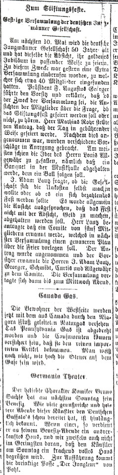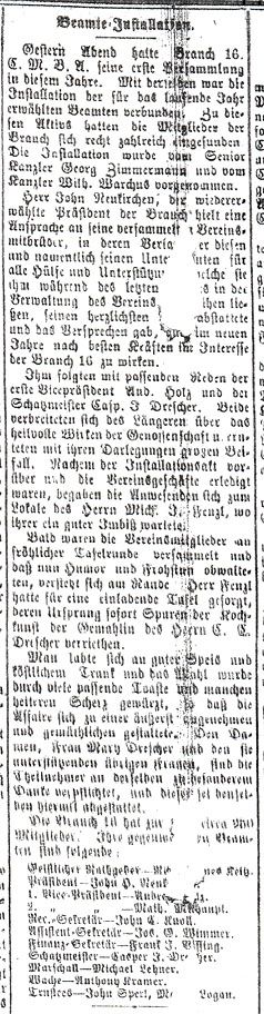 ![]() | Wed., Jan. 14, 1891 - Page 2, column 4 topInstallation of Officers----- Mr. John Neukirchen, the re-elected president of the Branch, made a speech before the assembled brethren in which he thanked his subordinant officers for their help and support with the governance of the society in the past year and ardently pledged to work to the best of his ability to further the interests of the Branch. Following this suitable speeches were made by Vice-President And. Holz and Treasurer Casp. J. Drescher. Both gave extensive details on the fine work done by the association. When the installation was complete and the association agenda was finished, those in attendance adjourned to the premises of Mr. Michael J. Fenzl, where a snack awaited them. Members of the association gathered at a round party table where humor and joking prevailed. Mr. Fenzl set a fine table, which came from the kitchen of the wife of Mr. C.C. Drescher. There was good food with plenty to drink and the meal was spiced up with many toasts and jokes, making the affair and thoroughly welcome and pleasant one. The participants gave thanks to the ladies who provided the meal, Mrs. Mary Drescher and her helpers. The ladies were reimbursed for the costs. Branch 16 has 250 members. Their current officers are: