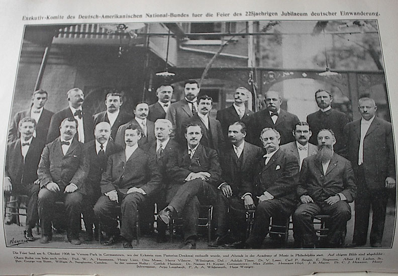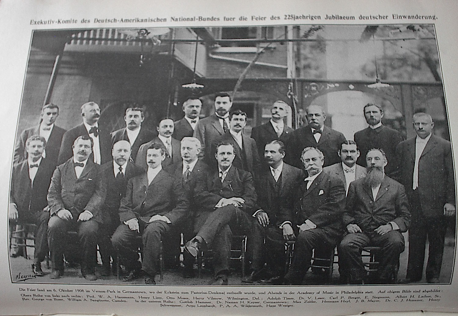 Caption above Group Portrait reads: Executive Committee of the National German-American Alliance on the occasion of the 225-Year Jubilee of German Immigration.