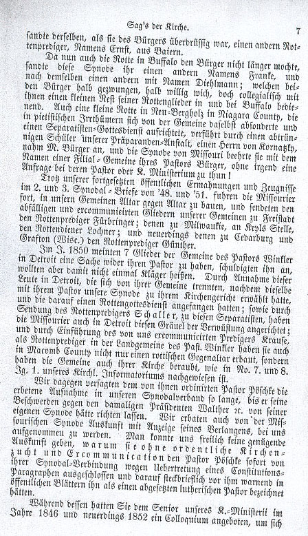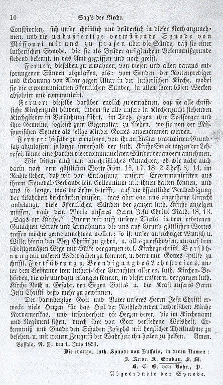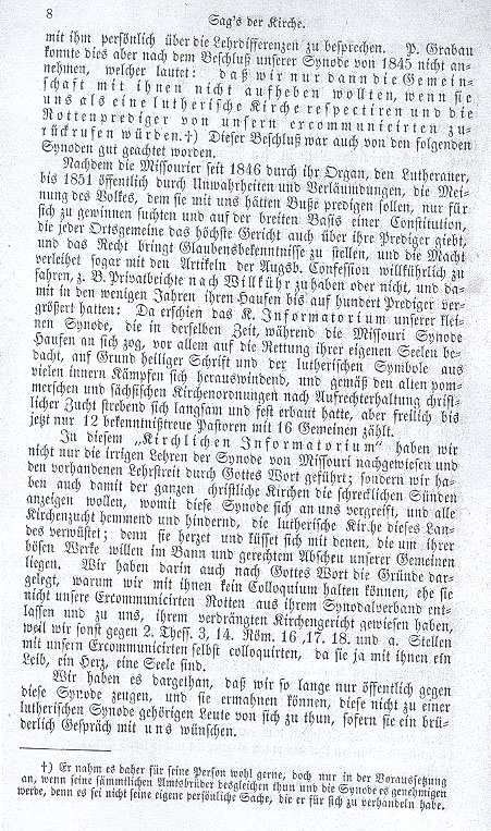 in order to discuss doctrinal differences with him in person. However Pastor Grabau could not accept this invitation after a decision made by our Synod in 1845, which stated: that we would hold no communion with them until such time as they respected us as a Lutheran church and called back the rogue ministers from our excommunicants. [1.] This resolution was well-heeded also in the following synods.