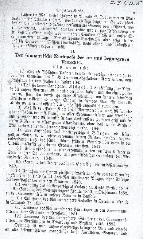 Afterwards through their publication The Lutheran the Missourians from 1846 to 1851 tried to win over public opinion by means of untruths and accusations — broad interpretation of a constitution gives each congregational district legal jurisdiction over its ministers and the right to posit a profession of faith and the power to freely interpret the articles of the Augsburg Confession, for example whether or not to have private confession — thus within a few years their numbers increased by a hundred preachers. At the same time as the Missouri Synod was drawing members from our group our small church's publication, Informatorium, dealt above all else with the saving of their souls based on the holy scriptures and the Lutheran symbols; for a long time it has striven to extricate itself from many internal battles and to firmly establish the preservation of Christian discipline in the face of the old Pommeranian and Saxon church regimes but now we only have 12 pastors with 16 congregations. In this Church Informatorium we have not only proven the erroneous doctrine of the Synod from Missouri and carried on the present dispute through the Word of God but we have also desired to show through it the dreadful sins of the entire Christian church whereby this Synod has insinuated itself upon us, limiting and hindering church discipline and devastating the Lutheran Church in this country; it endears itself to those who have been banned and shunned by our congregations because of their evil deeds. We have thus established in accordance with the Word of God the grounds whereby we can not hold colloquium with them if they do not expel our excommunicated gangs from their synodal assembly and lead them back to us from their church courts because in accordance with 2 Thessalonians 3, 14; Romans 16, 17, 18 and other verses we ourselves may hold colloquium with our excommunicants since they are of one body, one heart and one soul with them. We have demonstrated that we could publicly bear witness against this synod and warn them only for so long; this is not the activity of a people belonging to a Lutheran synod wishing to hold brotherly discussion with us. _____ [1.] He considered this beneficial yet only under the assumption that his assembled brothers in ministerial office would do the same and the synod would agree to it, however this was not a personal matter he should deal with by himself. Return to text |