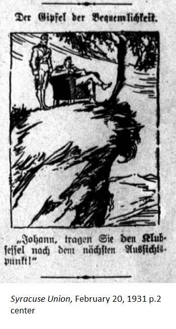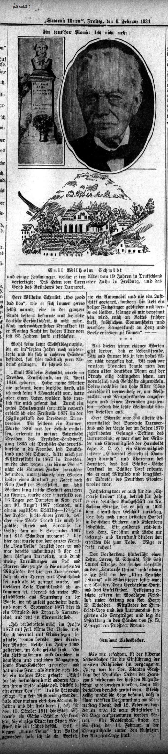 February 6, 1931 page 5 Mr. Wilhelm Schmidt, "the good bad boy" as he liked to call himself, was one of the best known and beloved German personalities. After an illness lasting many weeks he died Monday night at the advanced age of almost 85 years. The autobiography which he wrote last year and which we have in our hands we're going to print here word for word: "Emil Wilhelm Schmidt was born in Dresden, Germany on April 23, 1846. I never knew my mother because she died before I was 9 months old. However I had a father who faithfully cared for me. Due to a good monthly school in 1857 I obtained student status at the Dresden Gymnastics Society. I've been a gymnast ever since. I graduated from the school in 1860 and apprenticed in the lathe operator trade, became a journeyman in the trade abroad, saw Germany and Switzerland, signed up for compulsory military service in Dresden in 1867, but due to "weak legs" was not found useful as cannon fodder. Four weeks later I signed a contract for travel to New York on a sailing vessel, which would have allowed me to enjoy six weeks of fresh air. However in a matter of 16 days I landed in New York on August 30, 1867 with an English Schilling — 12 ½ cents in my pocket. I sought out a friend, who paid a weeks board for me; wrote to Syracuse for money; arrived on September 8, 1867 at 7 in the morning in debt for $15; was greeted cordially by the "Van Velde" family and already by 3 in the afternoon was at the gymnasium and due to my gymnastics exercises on the high and parallel bars I convinced those gym members present that I was a gymnast from Germany. When I was asked in what part of Germany I was from I handed over my membership card from Naumburg on the Saale, which was the last place I had worked. As of September 8, 1867 I was a member of the Syracuse Gymnastics Association, and currently I am an honorary member. "In 1872 I married Miss Alma Van Velde, who blessed me with four children, two of whom followed their mother in death in 1908. I've been newspaper man and a dealer in German and English-language magazines as well as a rent collector. When my wife was still alive I told her these true words, 'Because you've always shared your money with other people, you'll always be poor!' She sincerely responded, I'm not a millionaire, but I've maintained an honorable name and I am proud that since October 15, 1911 the city of Syracuse has a Goethe-Schiller Monument, the only city in New York State to own one. Because I hadn't become a soldier due to "weak legs," I'll never have a bicycle, or an automobile, or an airplane. Instead I'll remain a proud pedestrian for as long as God grants me fresh air, happy sunshine, a German song in my heart, and a soul with which to enjoy them all." His own words show that even at an advanced age he had not forgotten his love of life, his lively wit and his sense of humor. Until a few months ago people saw a good, old German man still going about his business on the street. Even in old age he still had beautiful penmanship, which he used to send Christmas amd New Years cards to his friends — this was the case right up to last Christmas. Mr. Schmidt was the oldest honorary member of the Syracuse Gymnastics Association and the last member of the Association's singing section established in 1870. He was a founder and honorary member of the Humboldt Lodge, German Order of the Harugari; an honorary member of the Historical Society of Onondaga County, and chairman of the Committee for the Goethe-Schiller Monument built in Schiller Park. He was also a member and many-year secretary of the German Pioneer Society. For years he was also involved with the Syracuse Union. He then operated a German bookstore on No. Salina St. until he retired from public business dealings in 1920. However he still maintained a private trade in German books and calendars. Right up to his death he had a pure gold, truly German heart, a cheerful nature, and a love of song and gymnastics. May he rest in peace! The departed leaves behind a son, Lorenz P. Schmidt, who previously was employed as a type setter at the Syracuse Union and later for some time at the Utica Deutsche Zeitung. He also had a daughter, Mrs. Gerhardine Hurst, and three grandchildren. A funeral was held yesterday at Woodlawn Cemetery conducted by Rev. Henry M. Schröder. Members of the Humboldt Lodge and the Gymnastics Association acted as pallbearers. Funeral arrangements were managed by F.W. Traugott on Prospect Ave. Loving Cup Winner We have learned that the silver loving cup for the installation of new members last year by the United States Grand Lodge of the German Order of the Harugari has again been awarded to the Augusta Lodge. We offer our heartfelt congratulations. At the same time the Lodge announced that at its next meeting on Thursday night, February 12th around 12 new members will be installed into the Lodge. There will be a masked ball on Saturday, February 14th in the Harugari Hall under the auspices of the Augusta Lodge. |