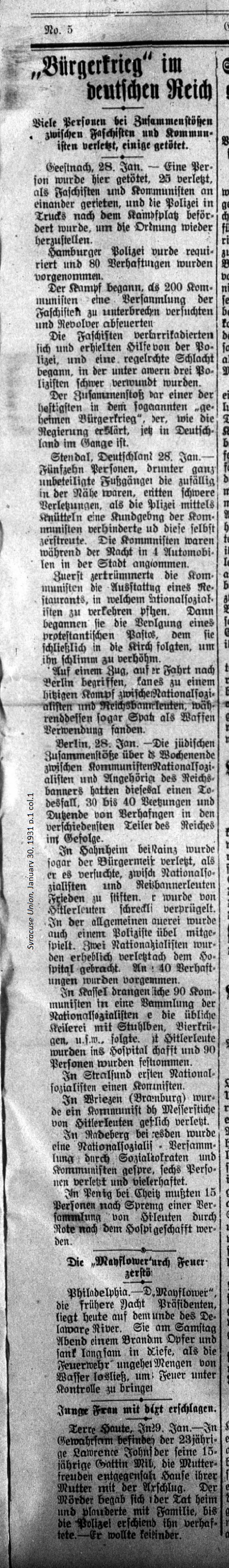 January 30, 1931 page 1 ______ Many People injured, a few dead, in Clashes between Fascists and Communists Hamburg Police were needed to take custody of 80 individuals. The fight began when 200 Communists attempted to break up a gathering of Fascists and revolvers were fired. The Fascists barricaded themselves and called the police for help. A veritable battle broke out and three people were severely wounded. The clash was one of the fiercest in the so-called "secret civil war," as the government calls it, currently happening in Germany. Stendal, Germany. Jan. 28th. — Fifteen people, including one passing pedestrian who just got too close, suffered serious injuries when the police used bludgeons to stop a rally by the Communists and disperse the crowd. The Communists had arrived in the city during the night in 4 automobiles. First the Communists shattered the equipment in a restaurant, which National Socialists were known to frequent. Then they began to menace a Protestant pastor, whom they followed into the church and taunted. On a train on its way to Berlin a heated battle broke out between National Socialists and federal railway employees during which shovels were used as weapons. Berlin, Jan. 28th. — Jewish clashes over the weekend between Communists, National Socialists, and supporters of the Reichs Banner [Social Democrats] left one person dead, 30 to 40 people injured and dozens in custody in various portions of the empire. In Hahnheim near Mainz the mayor was injured when he attempted to establish peace among National Socialists and Reichs Banner people. He was severely beaten by the Hitler people. In the melee a police officer was also attacked. Two National Socialists were significantly injured and sent to the hospital. Another 40 were taken into custody. In Kassel 90 Communists pushed their way into a National socialist meeting and the usual brawling with chair legs, beer mugs, etc. ensued. ??? Hitler followers were sent to the hospital and 90 people were arrested. In Stralsund National Socialists assaulted a Communist. In Wriezen (Brandenburg) a Communist was stabbed by Hitler people. In Radeberg near Dresden a National Socialist meeting was disrupted by Social Democrats and Communists. Six people were injured and many were arrested. In Penig near Chemnitz, after an assembly of Hitler people 5 people were sent to the hospital. The Mayflower destroyed by Fire _____ Philadelphia. The "Mayflower," a yacht once owned by the President, lies today at the bottom of the Delaware River. On Saturday it caught fire and slowly sank as the Fire Department tried to put the flames out with water and bring the fire under control. Young Wife slain with Ax _____ Terre Haute, Ind. Jan. 29. — 23 year old Lawrence Johnson is in custody for killing his wife, 15 year old expectant mother Mildred , with an ax. They were living in his wife's family. The murder happened in the house and Lawrence spoke with the family until the police arrested him. He did not want children. [Translator's Note: Parts of the text were missing so I consulted the January 28, 1931 issue of the Evansville Courier and Press to fill in the blanks.] |
