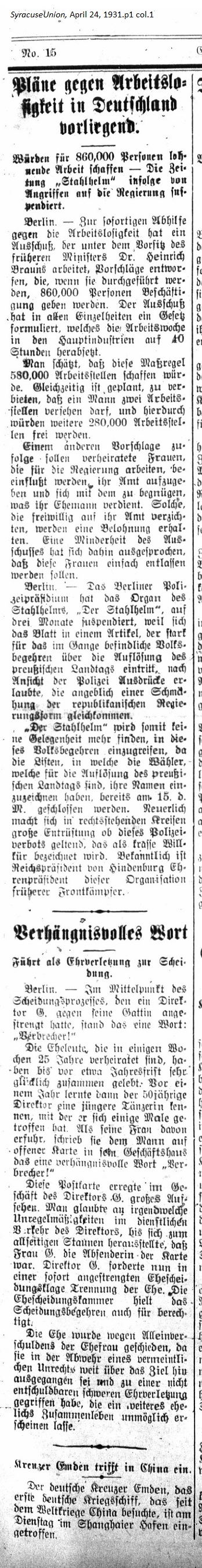 April 24, 1931 page 14 _____ Will create Gainful Employment for 860,000 People — The Newspaper Stahlhelm suspended after Attacks on the Government Berlin. — A committee under the chairmanship of former Minister Dr. Heinrich Braun has been formed to propose immediate relief for the unemployed, which once enacted will provide employment for 860,000 people. The committee has drafted legislation which sets the work week at 40 hours for the major industries. It's estimated that this measure will create 580,000 places for employment. It's also planned to prohibit one man from having two jobs, thereby freeing up another 280,000 jobs. In another proposal, married women who work for the government should be convinced to give up their positions and make do with what their husbands earn. Those who voluntarily give up their positions will receive a severence payment. A minority of committee members said that these women should simply be laid off. Berlin. — The Berlin Police Headquarters has suspended the organ of the Stahlhelms [World War I frontline soldiers paramilitary organization], Der Stahlhelm for three months because the newspaper published an article which strongly supported the people's desire for the dissolution of the Prussian Parliament. According to the Police the article is tantamount to hateful critique of the Republican form of government. Der Stahlhelm will no longer have an opportunity to become involved with this popular issue since the list containing the names of pro-dissolution voters was already closed on the 15th of this month. Furthermore, there was great outcry among the right-wing groups concerning whether this police sanction was valid and not purely arbitrary. It's well-known that Reichs President von Hindenburg is honorary president of this organization of former Front Line soldiers. _____ Libel leads to Divorce Berlin. — At the center of divorce proceedings which Director G. has leveled against his wife there is one word: "Villain!" The couple, who in a few weeks would be married for 25 years, lived happily together until a year ago. A year ago the 50-year-old director met a young dancer, with whom he went out a few times. When his wife found out about it, she sent a postcard to her husband's business containing one fateful word: "Villain!" This postcard caused quite a sensation in Director G.'s office. People believed in every possible irregularity in how the Director conducted business until to everyone's astonishment they learned that Mrs. G. was the sender of the card. Director G. immediately began divorce proceedings. The court also considered the request to dissolve the marriage justifiable. Failure for the marriage was attrbuted to the wife alone. She had overreacted to an alleged transgression and committed an unforgiveable, libellous offense, which would seem to make further marital union impossible. The Cruiser Emden sails to China _____ The German Cruise Emden, the first German warship to visit China since the World War, entered Shanghai Harbor on Tuesday.