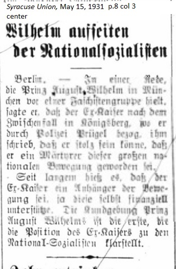 May 15, 1931 page 8 _____ Berlin. — In a speech which Prince August Wilhelm held in Munich before a group of Fascists, he said that after an incident in Königsberg where the former Kaiser was beaten by police, he wrote that he would be proud to be a martyr for this great national movement. This means that for a long time the former Kaiser may have been a member of the movement. In fact he may support them financially. Prince August Wilhelm's announcement is the first to clarify the position of the former Kaiser with regard to the National Socialists. |