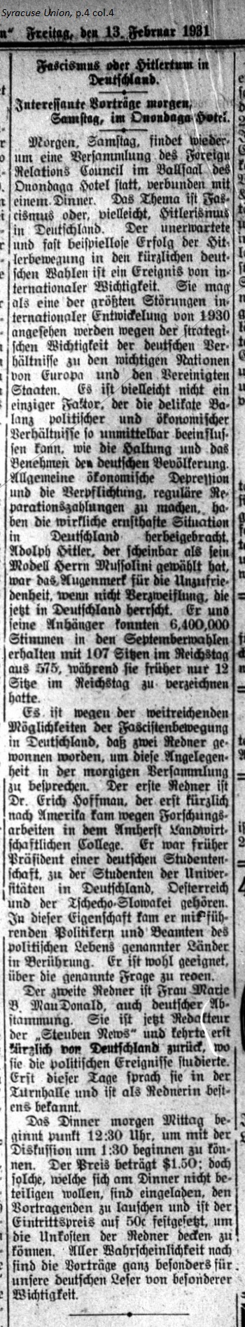 February 13, 1931 page 4 _____ Interesting Lectures Tomorrow, Saturday, at the Onondaga Hotel _____ Tomorrow, Saturday there will again be a meeting of the Foreign Relations Council in the ballroom of the Onondaga Hotel along with dinner. The theme will be Fascism, or perhaps Hitlerdom in Germany. The unexpected, and almost unprecedented result of the Hitler Movement in the recent German elections is an event of international import. It may be seen as one of the greatest disturbances to international progress in 1930 due to the strategic importance of the German relationship to the major nations of Europe and the United States. Perhaps it is not the only factor which can directly influence the delicate balance of political and economic conditions such as the attitude and the behavior of the German population. The overall economic depression and the obligation for making regular reparation payments have brought about a truly serious situation in Germany. Adolph Hitler, who seems to have taken Mr. Mussolini as his model, was the focal point for the discontent, if not the exasperation currently rampant in Germany. He and his followers received 6,400,000 votes in the September elections and 107 out of 575 seats in the Reichstag while previous they only had 12 seats. It is due to the wide-reaching possibilities of the Fascist Movement in Germany that two speakers have been chosen to speak about this issue at tomorrow's meeting. The first speaker is Dr. Erich Hoffman, who just recently came to America to perform research at Amherst Agricultural College. Earlier he was president of a German Student Association for students in Germany, Austria, and Czechoslovakia. In this capacity he came in contact with leading politicians and civil servants of these nations. He is well qualified to discuss the chosen topic. The second speaker is Mrs. Marie B. Macdonald, also of German heritage. She is currently editor of the Steuben News. She recently returned from Germany where she studied the political situation. Earlier today she spoke in the Gymnastics Hall. She is well known as an orator. The dinner tomorrow afternoon begins promptly at 12:30 so the discussion can begin at 1:30. The ticket price is $1.50. Those who do not wish to take part in the dinner are invited to listen to the lectures for an entry fee of 50 cents to cover the costs for the speakers. In all likelihood the lectures will be of particular interest for our German readers. |