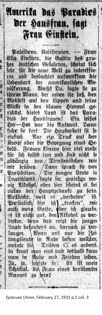 February 27, 1931 page 1 _____ Pasadena, California. — Mrs. Elsa Einstein, the wife of the great German scholar, has quite an interest in the New World and pays close attention to the lifestyles of the American public. Do you know, she said to her husband who was sitting next to her with a pencil to his lips and his gaze directed towards the sky, this country is a paradise for housewives! A soft Hm—Hm was his response. Then she continued: Housework is so easy. The push of a button or the movement of a lever. Women can do far more for themselves and are no longer dependent on servant girls like we were over there. Then they speak of Prohibition. Young people in Germany drink little alcohol but here it seems to be a major issue for many. Perhaps because it's "forbidden." Personally, I'm "dry" like my husband but I believe it's not good to prohibit alcohol. That especially provokes young people into wanting it. If the newspaper people would only leave us in peace, she intimated. It's different over there because they know us so they leave us to our peace and quiet. Yes, yes, she sighed. It's my fate, being the wife of a famous man! |