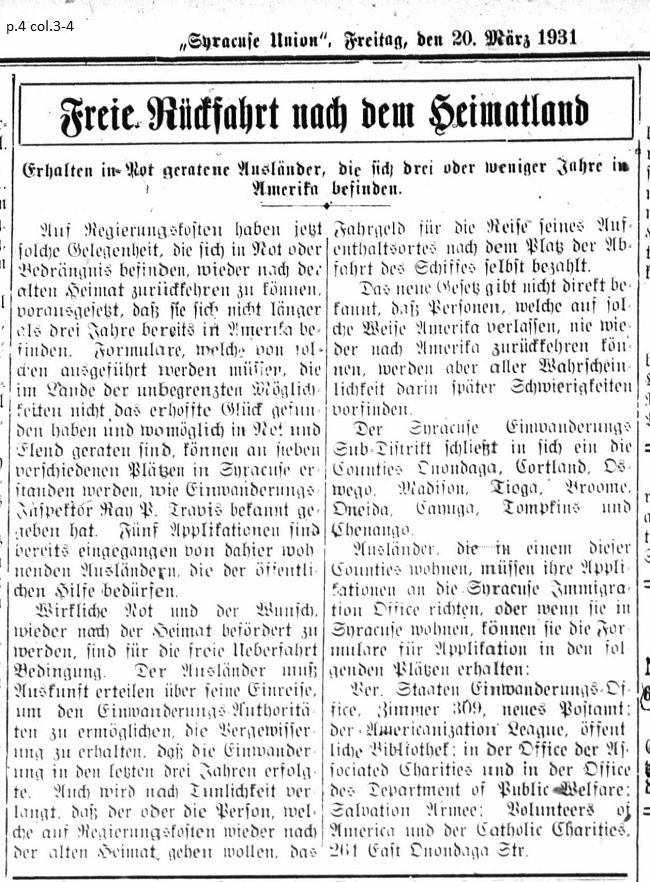 March 20, 1931 page 4 Available for Immigrants in Need, Who have been in America for Three or Fewer Years _____ True need and the desire to return to the homeland are the conditions for receiving free passage. The immigrant must give details about his trip into the country in order to give the Immigration Authorities the reassurance that the immigration was undertaken in the last three years. Expediency from the applicant is also required in order the receive passage at the government's expense. The new regulation does not give direct information that the people leaving America might not be able to return to America, however in all likelihood there will be difficulty trying to return later. The Syracuse Sub-District for Immigration serves Onondaga, Cortland, Oswego, Madison, Tioga, Broome, Oneida, Cayuga, Tompkins and Chenango counties. Immigrants who live in these counties must direct their applications to the Syracuse Immigration office. Those living in Syracuse may get their application forms from the following locations: The United States Immigration Office, Room 309, New Post Office; The Americanization League, Public Library; the Office of Associated Charities and the Office of the Department of Public Welfare; the Salvation Army; Volunteers of America and the Catholic Charities, 261 East Onondaga St. |