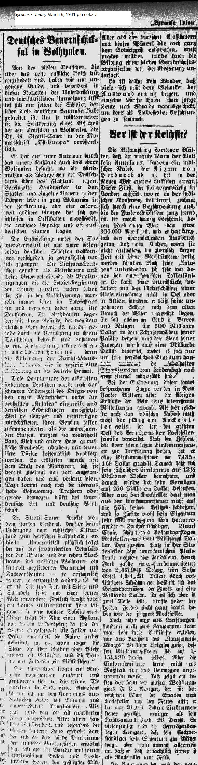 March 6, 1931 page 6 _____ Of the many Germans who settled over the wide expanse of the Russian Empire, we now have an unsubstantiated report. Especially in these dire times of oppression and economic upheaval, the veil over the fate of German farmers in Eastern Europe seldom lifts. Thus the visitor account by Dr. G. Strail-Sauer in the monthly periodical Ost Europe about the Germans of Volhynia is truly welcome. He took an auto tour through the interior of Russia and visited upper Volhynia, where the windmills loom as markers of the German population on the flatlands. Stray craftsmen in the cities and individual farmers in the villages live scattered throughout Volhynia, however other, much larger groups, which bear German characteristics and often German names, settled in closed enclaves. The development of both of these German castes are completely different, indeed going in opposite directions. As small farmers and tradesmen, the diaspora Germans enjoy the benefits which the Soviet government grants to the poor. They become ever more ensconced in the roots of Russification within the Soviet State and completely forget their German heritage. The groups of large farmers, on the other hand, are filled with the same spirit and they are strengthened by their oppression and cling firmly to their sense of national identity. Rejection of the Soviet lifestyle means adherence to the German homeland way of life. After the difficult and sad war years this main group of closed-settlement Germans were ranked by the new Russian power brokers along with the Kulaks [wealthy peasant farmers at odds with Collectivism] and they were placed under the same oppressive policies. Because they were more diligent and knowledgeable farmers their yields were greater than those of the surrounding Russians and they were repeatedly forced to cede land, cattle and other goods to new Russian settlers, who systematically settled in German villages. Many declared with the pride of matrydom that they have already started over twice and ostracized. Then there is the dreadful, high taxes. Despite or perhaps because of this they prosper in their agrarian, German way of life. Dr. Stratil-Sauer speaks of the strong impression made on him in transitioning from the cultivation of Russian land and that of more arable German soil. Suddenly and unexpectedly straw covered, mud huts in the Ukraine and crude blockhouses in Russian Volhynia were followed by compartmentalized timber-framed farm houses — amazingly clean, amazingly different, with doors and gates, sills and shingles freshly imported from a far-away world. Indeed a small culture center radiated with a character from a distant land. All around the landscape one catches a glance of a different state of being. Meadows are interconnected, fields are edged with hedges, groves well-pruned. There are even catwalks with railings over ditches and brooks; trees with nesting boxes. The farms are located at shouting-distance from each other and are grouped around a church. Individual buildings of an estate circle a square courtyard with a well and a dung heap. There is no deviation from this old pattern. Everything exemplifies cleanliness and order especially the gardens behind the houses, as opposed to the wild confusion of the typical Russian farm garden. It's a wonder, this uniformity of garden plots and gravel-paved paths; the carefully staked fruit trees. Old household furnishings were lost in the turmoil of war during which the German Volhynians were forced to the Russian interior or even farther off to Siberia, so new furnishing had to be procured. Despite this they held fast to the old ways, to their faith, and their customs, albeit that the German teachers had to give instruction according to the Communist educational program and church services could only be held on a few Sunday afternoons. Some of the younger farmers wanted to give up the old traditions as difficulties increased so they considered merging into a collective farm. However once the German owners of the large farms seriously studied these plans, which corresponded with the Soviet mindset, the government rejected the idea of such a communal endeavor. Thus it's no wonder that many are thinking of emigrating and individual villagers have sent off their young people to Canada to collect information on becoming prospective settlers. Who is the Richest? _____ New York newspapers came up with many new and interesting questions while discussing the other Croesuses of the world. The richest after the Indian nabob must be Rockefeller Jr., who currently controls the largest portion of the Rockefeller family fortune. According to the numbers provided by the last income tax statement he made available, he has paid an income tax of 7,435,169 Dollars. That left him an annual income of 12½ Million Dollars with total assets of 250 Million Dollars. However even with Rockefeller one cannot conclude from income tax the total worth of his property. One respected expert in the field, Stuart Chafe, estimated the total worth of Rockefeller's assets at 600 Million Dollars. In second place is American plutocrat Henry Ford, who paid $2,467,946 in income tax; his son; Edsel paid $1,984,254. Careful estimation brings the worth of total assets to One Billion Dollars. Since the Fords' worth is divided in two parts, neither of the two Fords has as much as Rockefeller Jr. One can make a huge income not just in automobiles but also in rubber, as with the Rubber King, William Wrigley, whose income tax amounts to 1,154,420 Dollars. However the income tax cannot act as the measure of total assets. This is shown most effectively the case with world financier J.P. Morgan, who ranks as the next richest man after Rockefeller and the Fords. He only paid 98,613 Dollars, less than his attorney John W. Davis. Morgan's assets are so varied that no expert dares to estimate the total value of his property, however one assumes that he is still considerab