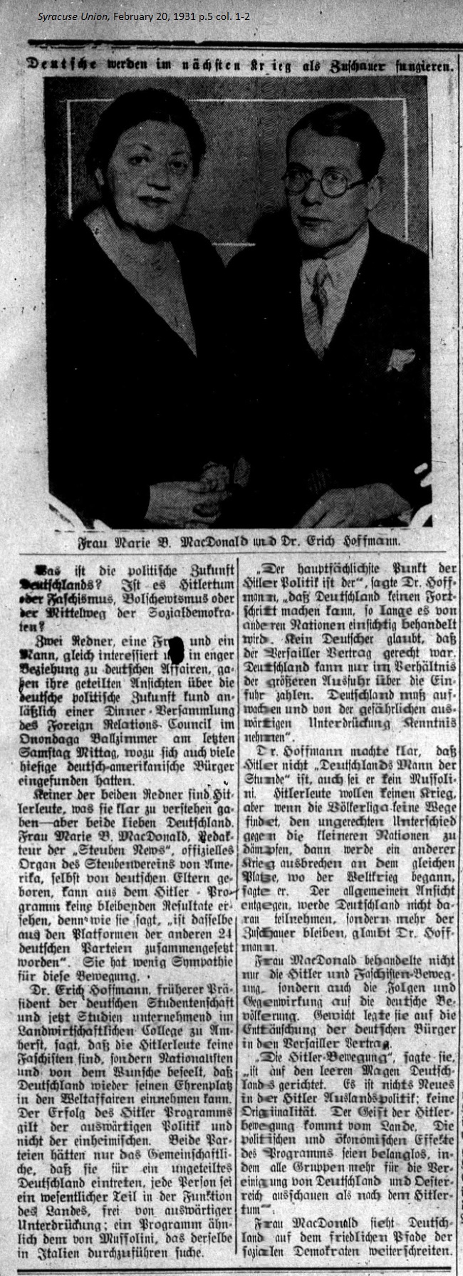 February 20, 1931 page 5 _____ Caption under picture reads: Mrs. Mary B. McDonald and Dr. Erich Hoffmann What is Germany's political future? Is it Hitlerdom or Fascism, Bolshevism or the middle road of the Social Democrats? Two speakers, one woman and one man, both presented items of interest in specific fields of German affairs. Each gave us his or her opinion of Germany's political future at a dinner meeting of the Foreign Relations Council at the Onondaga Ballroom last Saturday afternoon, which was well attended by local German-American citizens. Neither speaker is a Hitler proponent, which each clearly declared — however both love Germany. Mrs. Mary B. MacDonald, editor of the Steuben News, the official organ of the Steuben Society of America, is the child of German parents. She feels that no permanent results can come from the Hitler Program as she states, "it's pieced together from the platforms of the other 24 German Parties." She has little sympathy for the movement. Dr. Erich Hoffmann, former president of the German Student Association currently undertaking studies at the Agricultural College of Amherst, states that Hitler's people are not Fascists but Nationalists inspired by the desire to see Germany once again take its rightful place in world affairs. Hitler's Program is the result of foreign political trends and not domestic affairs. The only thing the two party systems have in common is their desire for a united Germany where each individual is an essential partner in the functioning of the nation, free of foreign oppression: one Program similar to that of Mussolini, which is being carried out in Italy. "The main point of Hitler's politics is," Dr. Hoffmann states, "that Germany cannot progress as long as it is comprehensively controlled by other nations. No German believes that the Versailles Treaty was fair. Germany can only pay based on the proportion of exports over imports. Germany must wake up and become aware of the dangerous oppression wielded by foreign nations. Mrs. MacDonald dealt with not only Hitler and the Faschist Movement but also the actions and reactions of the German people. She placed emphasis on the disillusionment of the German citizen with the Versailles Treaty. "The Hitler Movement," she said, "is directed towards the empty stomachs of Germany. There's nothing new in Hitler's foreign politics; no originality. The spirit of the Hitler Movement comes from the country. The political and economic effect of the Program may be inconsequential in that all groups seem more focused on the unification of Germany and Austria than on Hitlerdom." Mrs. MacDonald sees Germany moving along the peaceful path of the Social Democrats. |