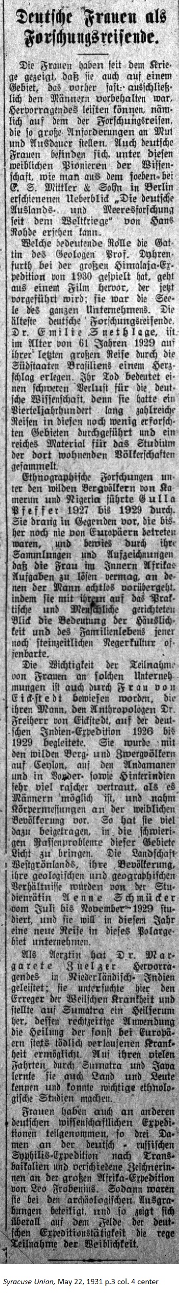 May 22, 1931 page 3 _____ Since the war women have shown that they can achieve greatness in a field of study previously reserved almost exclusively for men, namely the field of exploration, which places great demands on courage and stamina. There are German women among the female pioneers of science, as published in a survey written by Hans Rohde for C.S. Mittler & Son Publishing of Berlin titled Die deutsche Auslands- und Meeresforschung seit dem Weltkriege (German Foreign Land and Marine Research since the World War). The significant role which Geology Professor Dyhrenfurth's wife played during the great Himalayan Expedition of 1930 is currently being filmed. She was the soul of the entire enterprise. The oldest German female explorer was Dr. Emilie Snethlage, who in 1929 at the age of 61 succumbed to a heart attack during her last great journey through the southern states of Brazil. Her death was a dear loss to German science. For over a quarter of a century she had taken many trips through this seldom explored area and had assembled a wealth of material for the study of the people living in that region. Gulla Pfeffer conducted ethnographic exploration among the wild mountain folk of Cameroon and Nigeria between 1927 and 1929. She pentrated regions which previously had never been entered by a European and proved through her collections and records that a woman in Interior Africa can accomplish tasks which men have passed over. She published practical and humanistic overviews on the meaning of home and family in the native cultures. The importance of female participation in such enterprises has been demonstrated by Mrs. von Eickstedt, who accompanied her husband, anthropologist Baron von Eickstedt, on the German Expedition to India from 1926 to 1929. She was well acquainted with the wild mountain and pygmy populations of Ceylon, the Andaman Islands, and Lower India and was on better terms with them as would have been possible for men as she took measurements of the female populations. She contributed much to the understanding of the difficult race problems in this region. The secondary school teacher Aenne Schmücker studied the landscape of West Greenland, its people, its geological and geographic conditions from July to November 1929. In this year she will begin a new trip to this polar region. As a physician Dr. Margarete Zuelzer achieved marvelous things in Dutch India.She investigated the cause of Weil's disease and fabricated an antiserum in Sumatra whose timely application made it possible to heal Europeans from the deadly course of the disease. On her many travels through Sumatra and Java she also learned about the land and people and was able to make important ethnological studies. Women have also paricipated in other German scientific expeditions. Three ladies were on the German-Russian Syphilis Expedition to Transbaikal and various female illustrators went on the great African Expedition of Leo Frobenius. They participated on the archaeological digs. Women have taken part in many fields on German Expeditions. |