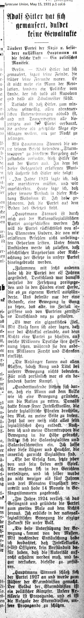 May 15, 1931 page 1 _____ Cleans up the Nazi Party and sacks Defiant Captain — A Political Manifest The fact is, at least temporarily, Hitler is averse to all rash untertakings, loudly denounces and banishes all those in the Party who would try to gain power through anything other than legal means. When Catptain Stennes attempted to incite the "Stormtroopers" under his command to direct action, Hitler expelled him from the Party. During this occasion Hitler issued the following manifest: "In 1923 I said that we must march, and then we marched. Today I say, that any further attempt in this direction is insanity. I have sworn that the Party will stand by the law. "Captain Stennes has been expelled from the National Socialist Party by me. I will ruthlessly clean the Party of all elements which do not unconditionally obey my orders. Under no circumstances will I abide intentional disobedience or disregard for the law within our Party. "Together with six other individuals I established this Party eleven years ago. However I can proudly say that only fate allowed me to create a Party out of nothing, one in which millions of Germans place their hope while millions of others are filled with fear and dread. "The Party members came from all classes, so rank and title mean nothing in our movement. Personally, for me it was a particularly difficult fight. Hundreds of thousands take issue with the fact that a man of the people like me established a movement to save the nation. Back then none of the intellectuals, who turn socialist phrases today, had the courage to stand by my side. Today, you never know what the socialist heart has discovered. After my stormtroopers and I brought the movement to prominence, the salon socialists and salon Bolsheviks made an appearance. But I hate these liars and hypocrites, who are not true socialists. "Before success arrived, each of us gambled his life. Everyone had to defend himself in court, and I was sentenced to no fewer than five years and three months in solitary confinement and spent 14 months behind prison walls. "In 1924 I was released from prison and reestablished the party for a second time out of nothingness. In the National Socialist Movement I see the only future for our people. "The best support of the movement comes from the masses. With growing disappointment I have observed that intellectuals, even officers, have no understanding that authority must be obtained honorably; to attempt to gain it any other way is to destroy it. "Captain Stennes joined the Party in 1927 and was made a leader of the Storm Division. The soldier of the Storm Division is a political warrior. Our artillery is propaganda, and it is the task of the Storm Division to defend our propaganda." |