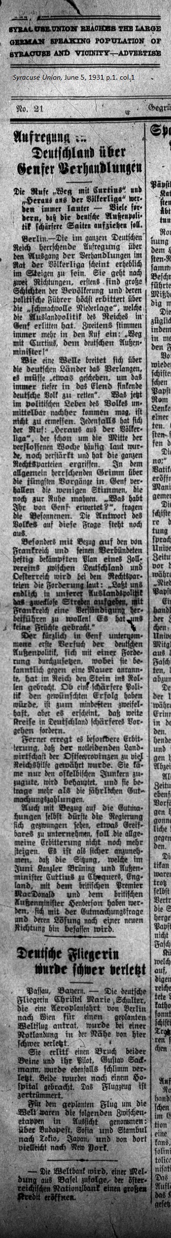 June 5, 1931 page 1 Commotion in Germany over the Geneva Negotiations _____ The calls "Out with Curtius" and "Leave the League of Nations" grow ever louder — Many demand that German Foreign Politics should take a Stronger Stance Like a wave sweeping over the German landscape there's the demand that "something must happen in order to save the German people from sinking in their misery." One cannot gauge just what has to occur in the political life of the people. Everywhere there's the cry "Get out of the League of Nations." That's already been shouted since the middle of the week, and even more strongly by the right-wing parties. The few voices which advised "calm down" are dying away amid the prevailing wrath about the recent proceedings in Geneva. "What did you expect from Geneva?" the more prudent ask. The people's response is still pending. This applies especially to the strongly contested plan by France and its allies for a German and Austrian Customs Union. The right-wing parties shout out the demand: "Let's give up the useless attempts in our foreign politics to come to an understanding with France! It has brought forth no fruit." Recently in Geneva the German Foreign Office tried to submit a protest against a mural. This set the ball rolling in the Empire. Whether a stronger political stance would have led to success is dubious, however it appears that wide circles in Germany demanded stronger approach. Furthermore particularly bitter sentiments erupted since the ailing agriculture economies of the Baltic provinces were granted too much financial assistance by the Empire. It was claimed that the only ones who benefited were the country squires living east of the Elbe and the amount added up to more than the yearly compensatory payment. With regard to the compensation itself, perhaps the government should see itself forced the undertake something tangible so the resentment does not increase. It seems certain that the meeting to be held in June between Chancellor Brüning and Foreign Minister Curtius in Chequers, England with British Prime Minister MacDonald and British Foreign Minister Henderson will deal with the compensation questions and set the course for resolving the issues. German Female Aviator is seriously injured. _____ Passau, Bavaria. — The German aviator Christel Marie Schulter, who boarded an airplane going from Berlin to Vienna as part of a planned flight around the world, was seriously injured during an emergency landing near here. She suffered breaks in both legs. Her pilot, Gustav Sackmann was severely injured. Both were taken to the hospital. The airplane was shattered to pieces. The interim destinations for the planned flight around the world were as follows: Budapest, Sofia, and Istambul to Tokyo, Japan and from there perhaps to New York. |