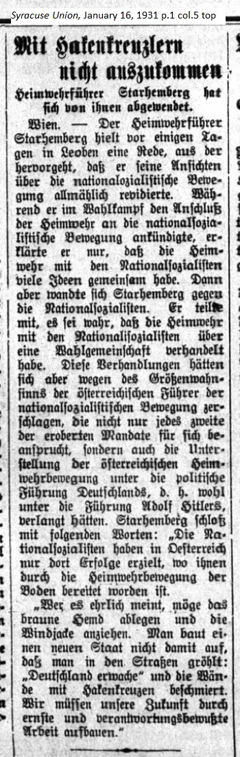 January 16, 1931 page 1 Home Guard Leader Starhemberg has turned away from them. "Whoever sincerely thinks about it may get rid of the brown shirt and put on the windbreaker jacket. You can't build a nation when people are crying out in the street 'Germany, awake' and smearing walls with swastikas. We must create our future through earnest and responsible labor." |