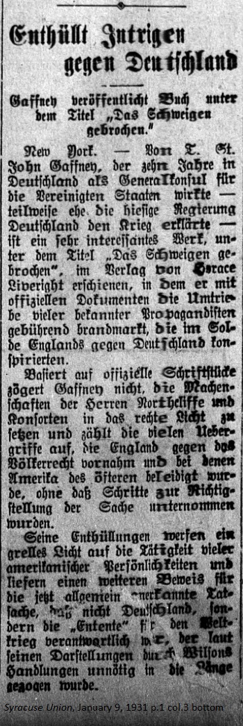 January 9, 1931 page 1 _____ Gaffney publishes Book under the Title Breaking the Silence. Based on these documents Gaffney does not hesitate to place the machinations of Mr. Northcliffe and his consorts in a proper light. He lists the numerous incursions which England perpetrated against International Law, which often offended America, yet no steps were ever taken to rectify the matter. His revelations cast a harsh light upon the activities of many American personalities and deliver further proof contesting the generally acknowledged fact that it wasn't Germany but the "Entente" which was responsible for the World War. According to his interpretation, in the long run Wilson's involvement would have been unnecessary. |