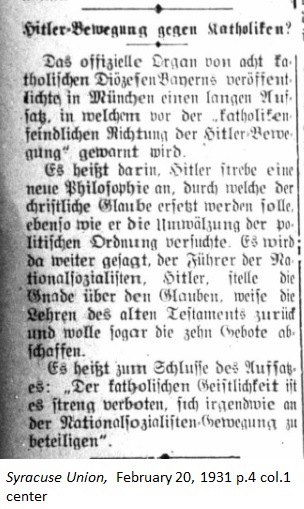 February 20, 1931 page 4 _____ The official organ of 8 Catholic Dioceses in Bavaria published a lengthy article in Munich, in which a warning was issued concerning the "Anti-Catholic direction of the Hitler Movement." It states that "Hitler strives towards a new philosophy through which the Christian faith should be replaced just as he attempted to radically change the political order. The leader of the National Socialists further stated mercy should be valued more than faith, the teachings of the Old Testament should be rejected, and the Ten Commandments should be abolished. In the end the article it is stated, "Catholic spirituality will be strictly forbidden from having any part in the National Socialist Movement." |