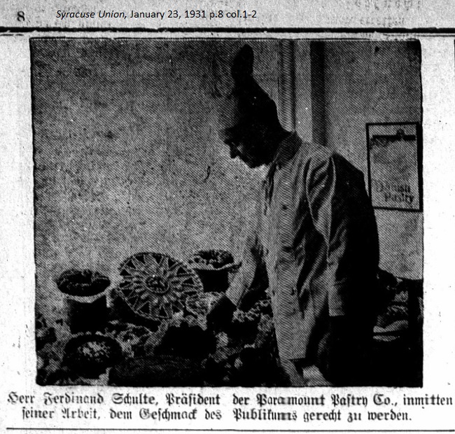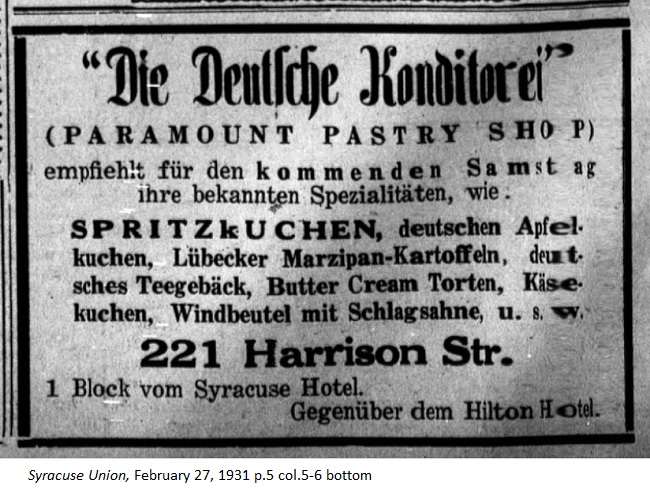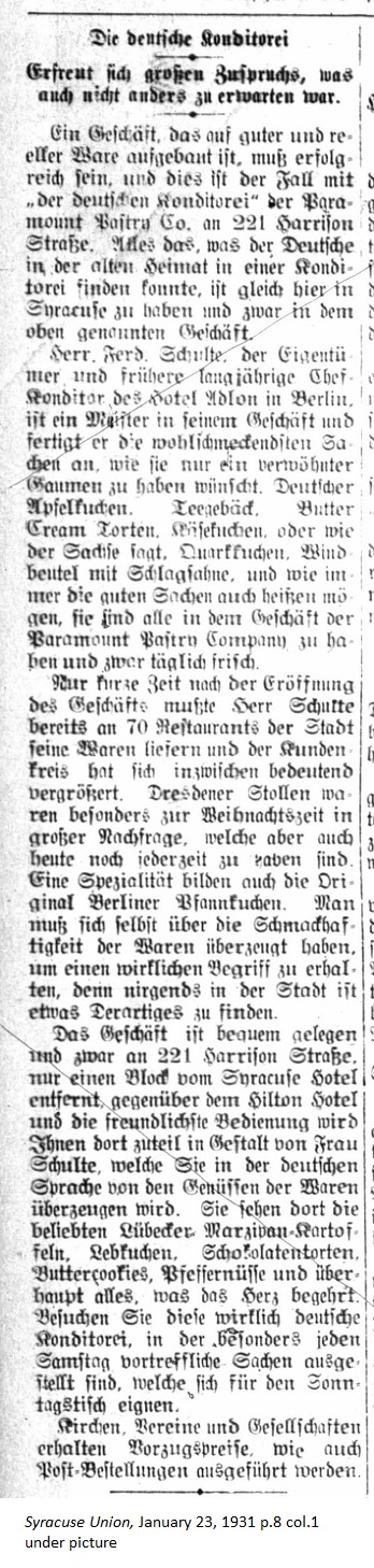 January 23, 1931 page 8 _____ Enjoys Great Popularity, as was expected. _____ A business built on fine and geniune ingredients just has to be successful, and this is the case with the "Deutsche Konditorei" of the Paramount Pastry Co. at 221 Harrison St. Everything the German could possibly find in a bakery in the old homeland can be found here in Syracuse at the above named business. Mr. Ferd. Schulte is the business owner. Previously he was the head pastry chef at the Hotel Adlon in Berlin. He is a master at his craft and he produces the best tasting baked goods suitable for the pampered palate. German apple tarts, tea cakes, buttercream torts, cheesecakes, cream puffs [literally wind bags with whipped cream] or whatever you may call them, they're all freshly baked and available daily at the Paramount Pastry Company. Shortly after the business opened Mr. Schulte was already delivering his wares to 70 restaurants. Since then the customer base has increased significantly. Dresden fruitcake is especially in demand at Christmas time but it can be had anytime. The original Berliner jelly donut is a specialty of the house. You have to try the baked goods for yourself in order to understand that they're nothing like anything else in the city. The business is conveniently located at 221 Harrison St., only a block from the Syracuse Hotel and across the street from the Hilton Hotel. You'll receive truly friendly service from Mrs. Schulte, who will convince you in the German language about how best to enjoy the baked goods. You'll find the popular Lubeck marzipan potatoes, gingerbread, chocolate tortes, butter cookies, spice cookies, and everything your heart desires. Visit a real German bakery, which displays wonderful wares each Saturday just right for your Sunday table. Churches, organizations, and businesses receive discount prices. Mail orders are also accepted. |