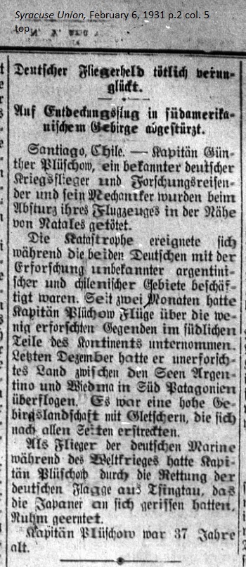 February 6, 1931 page 2 _____ Crashes while making Exploratory Flight of a Mountain Chain in South America Santiago, Chile. — Captain Günther Plüchow [sic], a well-known combat pilot and explorer, and his mechanic were killed in a crash of their aircraft near Natales. The catastrophe occurred while both Germans were busy exploring an unknown section of Argentina and Chile. Captain Plüchow had been flying over the unexplored region of the southern continent for two months. Last December he flew over unknown territory between the Argentine Sea and Viedma Lake in southern Patagonia. It was a high-altitude mountainous region with glaciers stretching out on all sides. Captain Plüchow was 37 years old. |