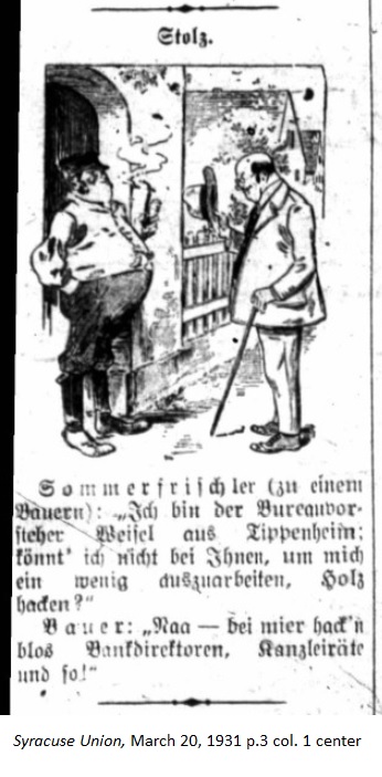 March 20, 1931 page 3 Summer Vacationer (to a farmer): "I am Bureau Chief Weisel from Tippenheim. Could I perhaps do some work for you like chopping wood?" Farmer: "Nope. I only let Bank Directors and Chancellery Advisors chop my wood." |