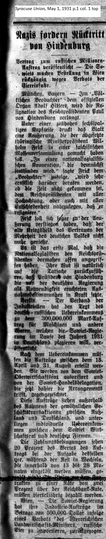 May 1, 1931 page 1 _____ Contract to Russian Millions made Public — The Soviets rescinds Orders in Vienna due to the Ban on Egg Imports Under an inch-high heading spanning six columns the newspaper printed a statement allegedly made by Thuringian Minister-President Wilhelm Frick at a Fascist assembly. "At a National Socialist Convention," Frick told the Beobachter afterwards, "there's been serious deliberation over whether the time has come for the respectful yet decisive suggestion that the Reichs President resign." Frick went on to say that the old war hero no longer has the trust of the majority of German people. It is the first time that the National Socialists have openly attacked the Reichs President. Their anger naturally goes back to the fact that President von Hindenburg has had the government enact extraordinary provisions, which he deemed necessary. Berlin. — A group of industrialists has published the text for a 300,000,00 Mark contract for machinery and other goods, which the Soviet Goverment will place in Germany between April 15th and August 31st. They will be authorized by the Upper Soviet Economic Advisory Board and co-signed by tbe Soviet Trade Delegation, which will handle the arrangements here. The contracts are beyond the usual framework for business transactions between Germany and Russia and are subject to individual stipulations by the Soviet Economic Advisory Board and the German firms. Payment arrangements are set at 20 percent at time of order while the remainer must be paid withn 13 to 28 months ********* at a rate of 2 percent above the Reichs Bank rate, compounded quarterly. Vienna. — The Soviet Government has rescinded its industry contracts worth 500,000 Dollars as the result of a ban by the Austrian Agricultural Ministry on the import of Russian eggs. |