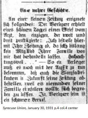 January 30, 1931 page 4 _____ At a small newspaper the following occurred: One fine day the publisher received a letter from a physician who practiced far and wide. "I hereby cancel my subscription to your newspaper since for some time I have not treated any member of your family. Respectfully, ..." — So, does that mean the publisher might have to worry about the coffin maker cancelling his subscription in the future because no member of his family wants to be buried? Really, being a publisher is a difficult occupation. |